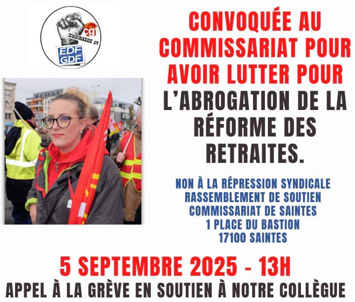 Dans la continuité des plus de 1000 sanctionnés de la CGT en 2024, dont environ 400 de nos camarades de la FNME-CGT, c’est au tour de Mathilde CANIVET, dirigeante de notre fédération, d’être convoquée au commissariat.